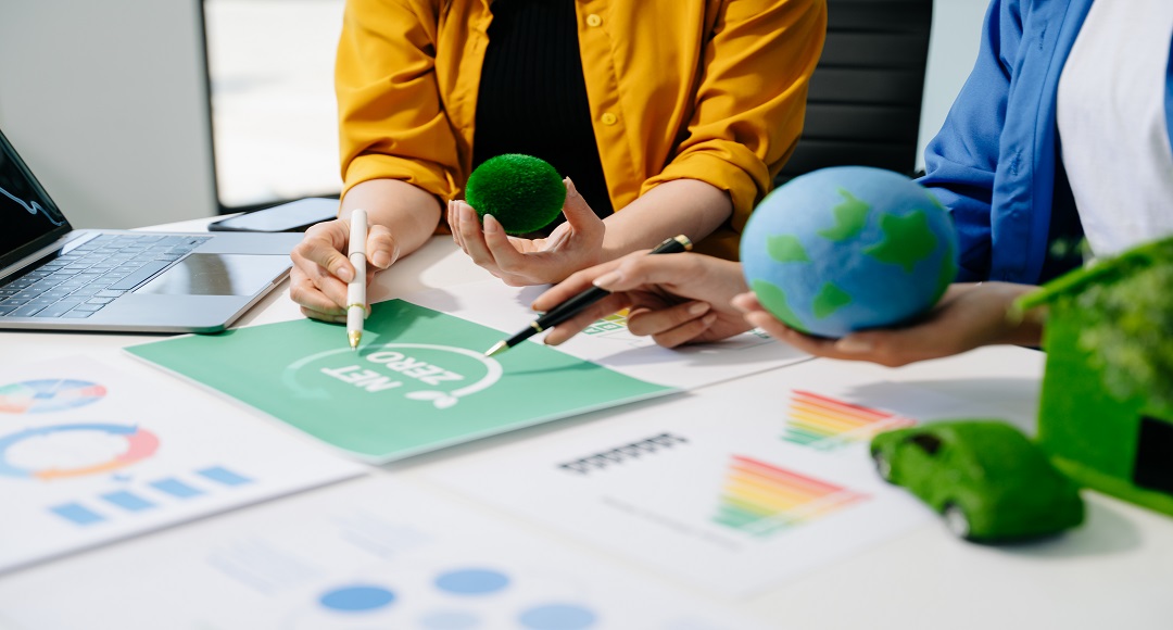 ESG concept of environmental, Green ethical business preserving resources, reducing CO2, Business person team working on laptop virtual smartphone to reduce CO2 emissions carbon