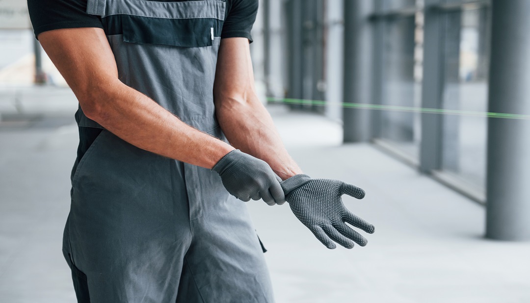 Man in grey uniform wearing gloves and preparing for work indoors in modern big office at daytime.